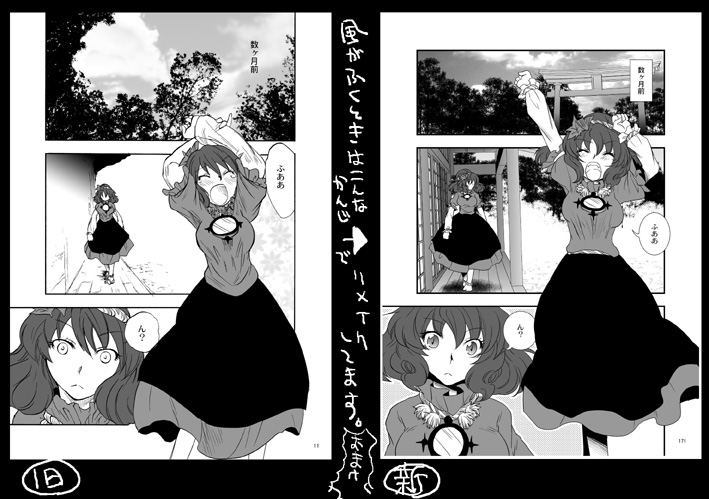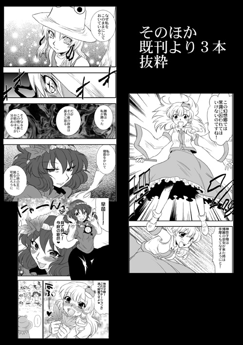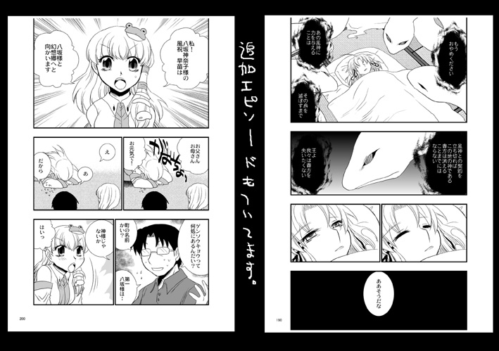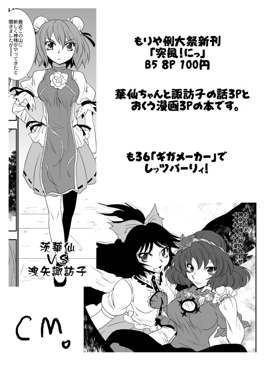 新刊「風のとおりみち」 B6 356P 1500円 既刊 「突風!」B5 8P 100円 「洩矢諏訪子VS幻想郷少女」B5 52P 500円 「俺得!神奈子様うふふ」B5 32P 400円 18禁 「誠にもふもふうにゃうにゃで猫耳肉球である!いざにゃむさん」400円 おっぱいマウスパッド 2000円 以上も持っていきます。 追記★新刊はパ15a「 Four Leaves Clover」でも委託してもらってます。 四葉さんの地獄街道4人娘本もよぅチェックやで! 当日はスケブは申し訳ありませんが受け付けていません。 当日は晴れつつもはんなり薄曇りでなにやら涼しい。そんな天気だといいですね。 水分補給しつつ戦場を楽しみませう!