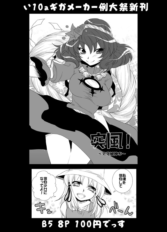 今回はディシディア012が立ちふさがって入稿への道をうぼあー EDやっと見れたけどやはりラストの持ってきかたはいいね! あとレポートがなかなかおもしろい。ギルガメがいいキャラだ・・・ おおっとげっふん い10a「ギガメーカー」 新刊 「突風!」B5 8P 100円 最近のアニメネタを入れたショート漫画3本です。 きっと新刊 「洩矢諏訪子VS幻想郷少女」B5 52P 500円 既刊 「エクストリーム風神信仰」400円 「誠にもふもふうにゃうにゃで猫耳肉球である!いざにゃむさん」400円 おっぱいマウスパッド 2000円 新刊は結構な量を持ってきていますです。 んでもってスケブですが申し訳ありませんが今回は受けつけませんです。 それでは会場にて~ PR